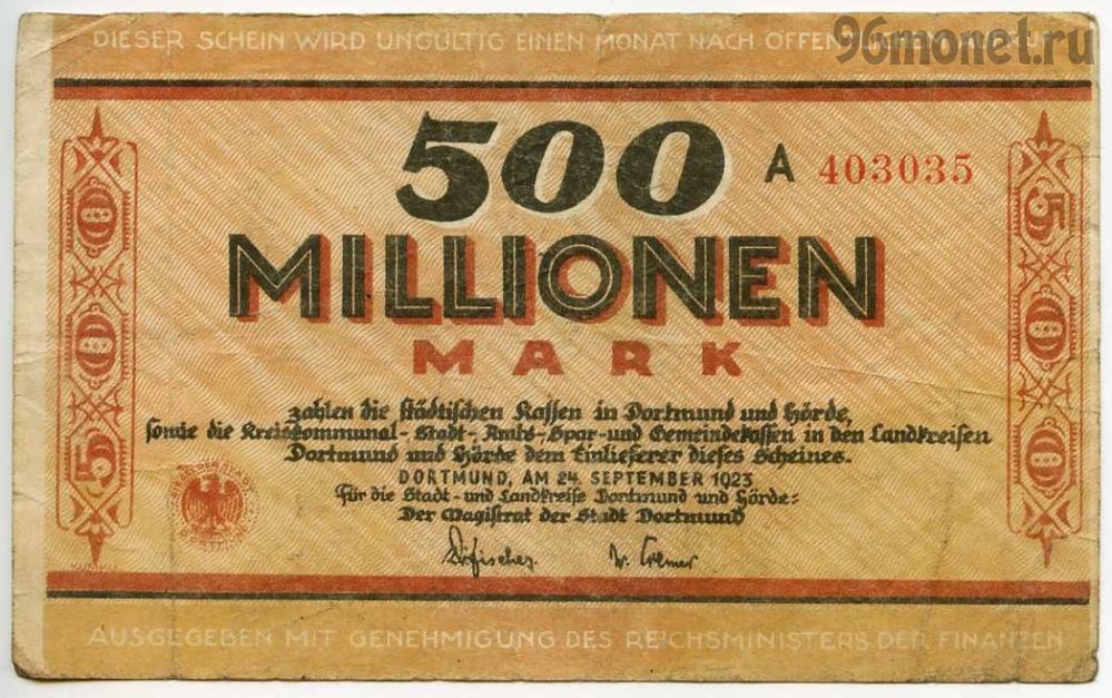 Описание Германия. Нотгельд г. Дортмунд 500.000.000 марок 1923