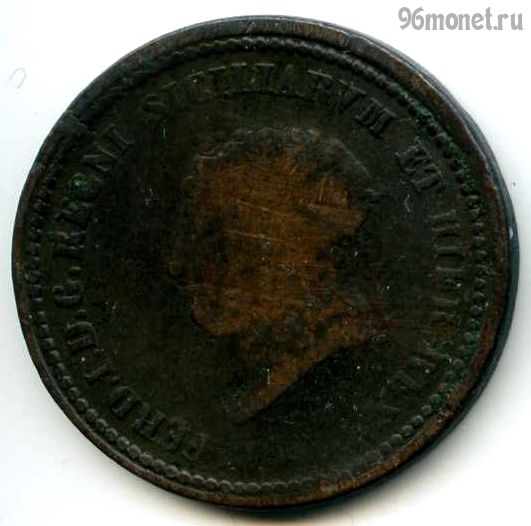 Королевство обеих Сицилий («Неаполитанское королевство») —  государство в Южной Италии, существовавшее в период 1816-61 гг. Создано при объединении Неаполитанского и Сицилийского королевств. Столица - Неаполь. Тип 1 - короткий текст в легенде. Диаметр 31 мм.