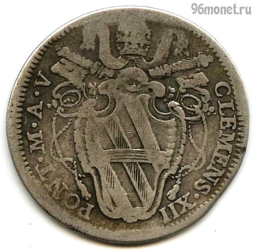 Папская область (752—1870) — теократическое государство, существовавшее в Центральной Италии и возглавлявшееся папой римским. Тестон — название серебряных монет различных итальянских государств XV—XIX столетий. 1 тестон = 30 байокко. Серебро 917 пробы, 8,1 г, диаметр 31 мм. Папа Климент XII. Год 5.