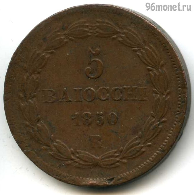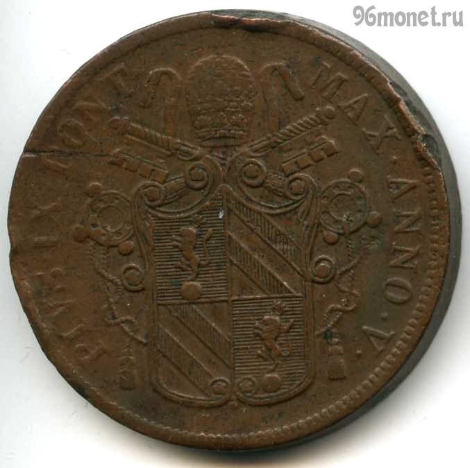 Папская область (752—1870) — теократическое государство, существовавшее в Центральной Италии и возглавлявшееся папой римским. Папский скудо — денежная единица Папской области, имевшая хождение до 1866 года. 1 папский скудо = 100 байокко, 1 байокко = 5 кваттрино. Медь, диаметр 40 мм. Папа Пий IX. Год 5. Монетный двор - Рим (Италия) "R".