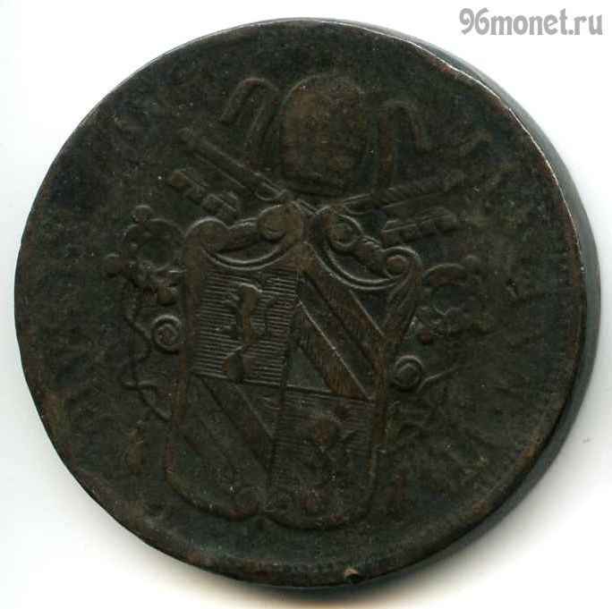 Папская область (752—1870) — теократическое государство, существовавшее в Центральной Италии и возглавлявшееся папой римским. Папский скудо — денежная единица Папской области, имевшая хождение до 1866 года. 1 папский скудо = 100 байокко, 1 байокко = 5 кваттрино. Медь, диаметр 40 мм. Папа Пий IX. Год 7. Монетный двор - Венеция (Италия) "B".