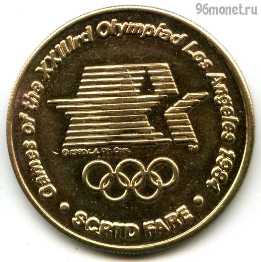 Транспортный жетон из официального набора (всего в наборе 24 шт.), посвященного XXIII летним Олимпийским играм в Лос-Анджелесе (США) в 1984 году. The Southern California Rapid Transit District (SCRTD) — агентство общественного транспорта, обслуживающее столичный регион Лос-Анджелеса. Диаметр 32 мм, латунь.