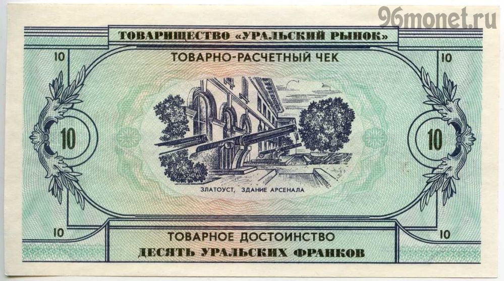 Товарно-расчетные чеки «уральские франки» были изготовлены в 1991 году на Пермской печатной фабрике «Гознак» по заказу екатеринбургского предприятия ТОО «Уральский рынок». Отпечатано было 1 миллион 930 тысяч штук номиналами 1, 5, 10, 20, 50, 100, 500 и 1000 «уральских франков» на общую сумму в 56 млн франков. В 1997 году «уральские франки» номиналом 1, 5, 10, 20 были выпущены в обращение на серовском Металлургическом заводе им. А. К. Серова, где генеральным директором к тому времени был Антон Баков. Ими можно было расплачиваться в заводских магазинах, столовых и буфетах. В распоряжении дирекции оказалось больше половины тиража — 1 миллион штук, судьба остальных 930 тысяч штук неизвестна. |