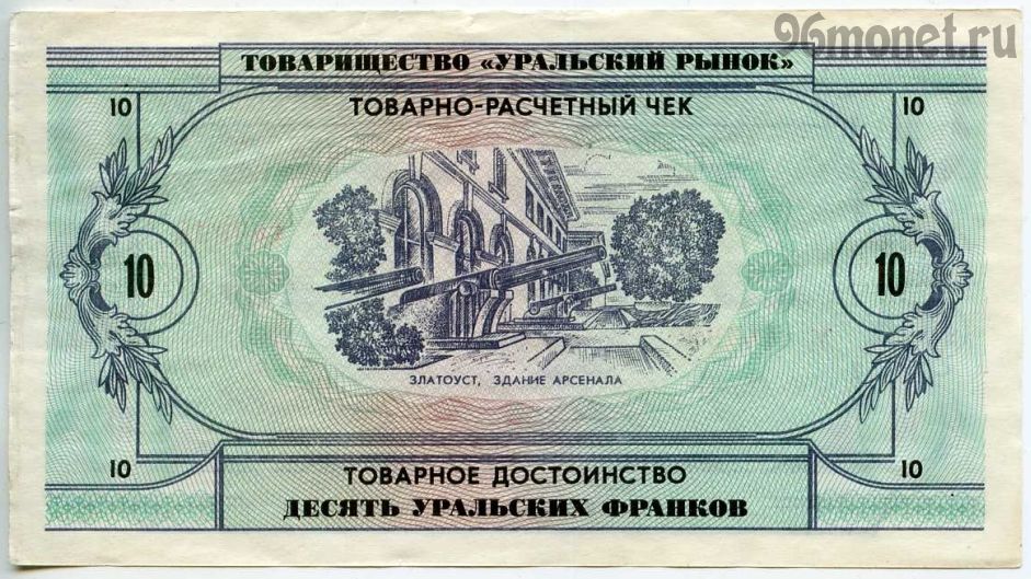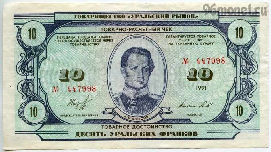 Товарно-расчетные чеки «уральские франки» были изготовлены в 1991 году на Пермской печатной фабрике «Гознак» по заказу екатеринбургского предприятия ТОО «Уральский рынок». Отпечатано было 1 миллион 930 тысяч штук номиналами 1, 5, 10, 20, 50, 100, 500 и 1000 «уральских франков» на общую сумму в 56 млн франков. В 1997 году «уральские франки» номиналом 1, 5, 10, 20 были выпущены в обращение на серовском Металлургическом заводе им. А. К. Серова, где генеральным директором к тому времени был Антон Баков. Ими можно было расплачиваться в заводских магазинах, столовых и буфетах. В распоряжении дирекции оказалось больше половины тиража — 1 миллион штук, судьба остальных 930 тысяч штук неизвестна. С этим товаром смотрят |