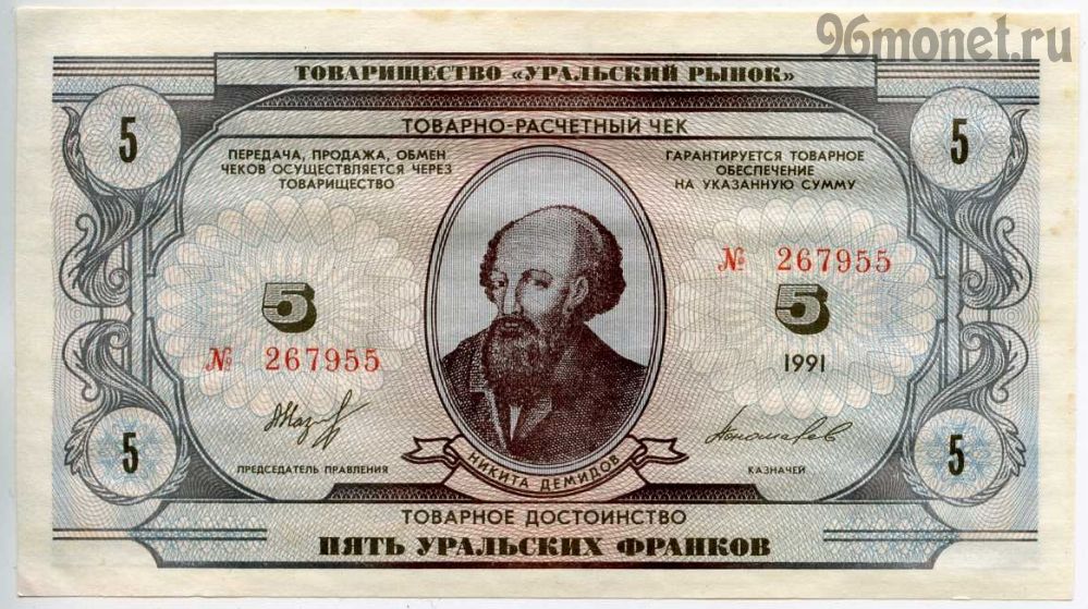 Товарно-расчетные чеки «уральские франки» были изготовлены в 1991 году на Пермской печатной фабрике «Гознак» по заказу екатеринбургского предприятия ТОО «Уральский рынок». Отпечатано было 1 миллион 930 тысяч штук номиналами 1, 5, 10, 20, 50, 100, 500 и 1000 «уральских франков» на общую сумму в 56 млн франков. В 1997 году «уральские франки» номиналом 1, 5, 10, 20 были выпущены в обращение на Металлургическом заводе им. А. К. Серова в г. Серове Свердловской области, где генеральным директором к тому времени был Антон Баков. Ими можно было расплачиваться в заводских магазинах, столовых и буфетах. В распоряжении дирекции оказалось больше половины тиража — 1 миллион штук, судьба остальных 930 тысяч штук неизвестна. С этим товаром смотрят |