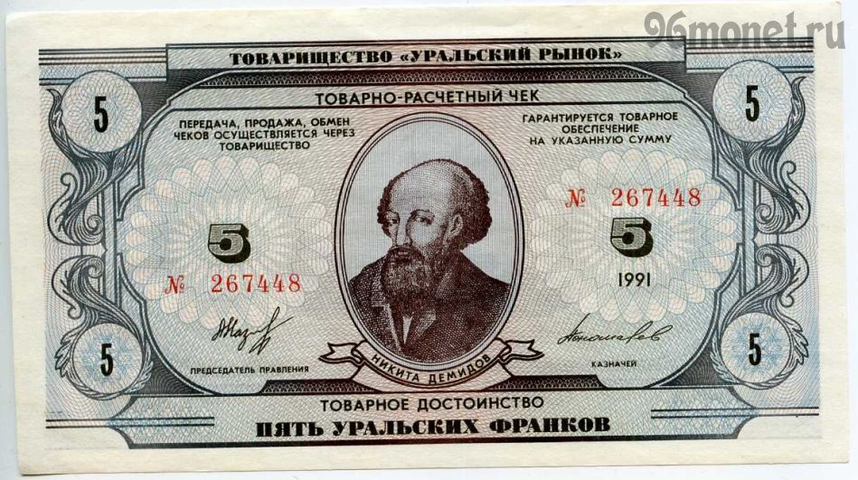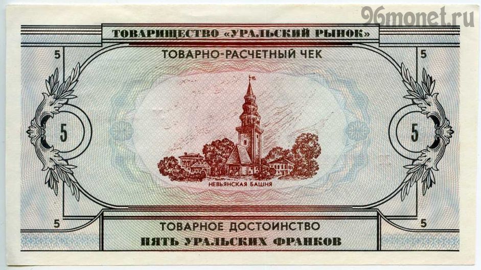 Товарно-расчетные чеки «уральские франки» были изготовлены в 1991 году на Пермской печатной фабрике «Гознак» по заказу екатеринбургского предприятия ТОО «Уральский рынок». Отпечатано было 1 миллион 930 тысяч штук номиналами 1, 5, 10, 20, 50, 100, 500 и 1000 «уральских франков» на общую сумму в 56 млн франков. В 1997 году «уральские франки» номиналом 1, 5, 10, 20 были выпущены в обращение на серовском Металлургическом заводе им. А. К. Серова, где генеральным директором к тому времени был Антон Баков. Ими можно было расплачиваться в заводских магазинах, столовых и буфетах. В распоряжении дирекции оказалось больше половины тиража — 1 миллион штук, судьба остальных 930 тысяч штук неизвестна. С этим товаром смотрят |
