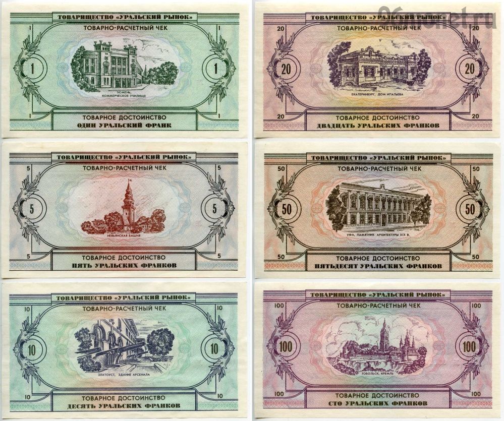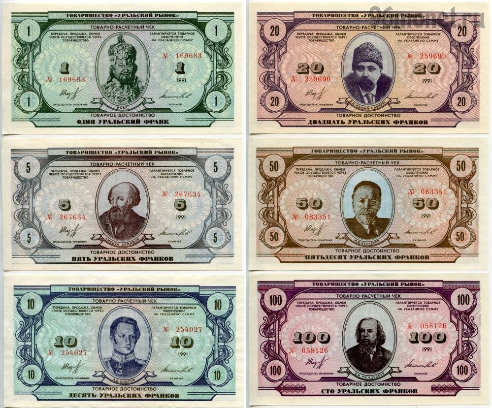 Товарно-расчетные чеки «уральские франки» были изготовлены в 1991 году на Пермской печатной фабрике «Гознак» по заказу екатеринбургского предприятия ТОО «Уральский рынок». Отпечатано было 1 миллион 930 тысяч штук номиналами 1, 5, 10, 20, 50, 100, 500 и 1000 «уральских франков» на общую сумму в 56 млн франков. В 1997 году «уральские франки» номиналом 1, 5, 10, 20 были выпущены в обращение на серовском Металлургическом заводе им. А. К. Серова, где генеральным директором к тому времени был Антон Баков. Ими можно было расплачиваться в заводских магазинах, столовых и буфетах. В распоряжении дирекции оказалось больше половины тиража — 1 миллион штук, судьба остальных 930 тысяч штук неизвестна. |
